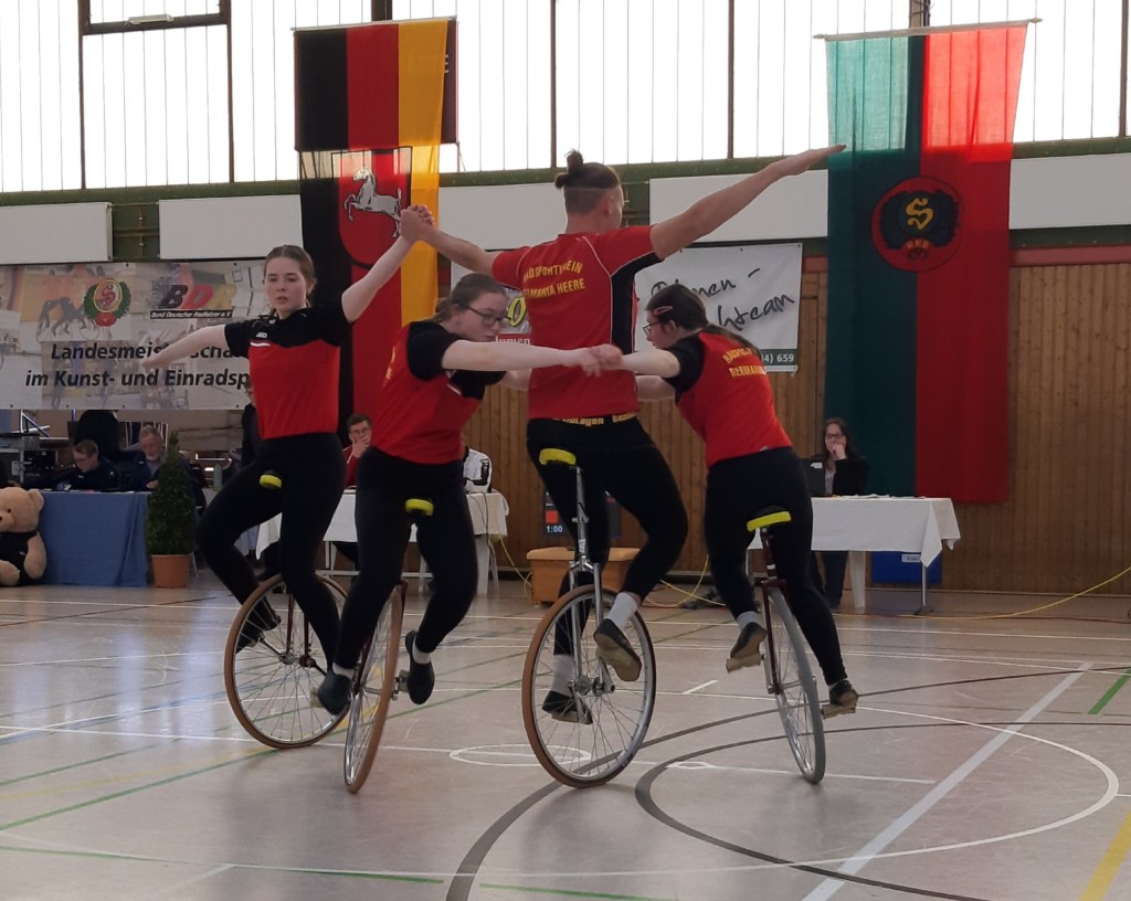 auch gleichzeitig das Halbfinale zur Deutschen Meisterschaft war. Am Start waren insgesamt 54 Mannschaften aus ganz Deutschland, im 4er und 6er Kunstradsport, sowie im 4er und 6er Einradsport. In einer Vorrunde mit allen Mannschaften wurden die Tickets für die Deutsche Meisterschaft der Junioren vergeben. Leider konnten die Teilnehmer des RSV Germania Heere, wie im Vorfeld geplant, nicht bereits am Freitag anreisen, weil ein Sportler noch bis 18 Uhr arbeiten musste. So machte sich ihr Trainer und die 4er Einradsportmannschaft der „Junioren offen“ erst Samstag Nacht um 2 Uhr auf die ca. 390 Kilometer lange Strecke nach Worms. Pünktlich nach der Sporthallenöffnung, um 7 Uhr, konnte das Team noch eine Trainingseinheit auf der Wettkampffläche und anschließend auf der Trainingsfläche absolvieren.