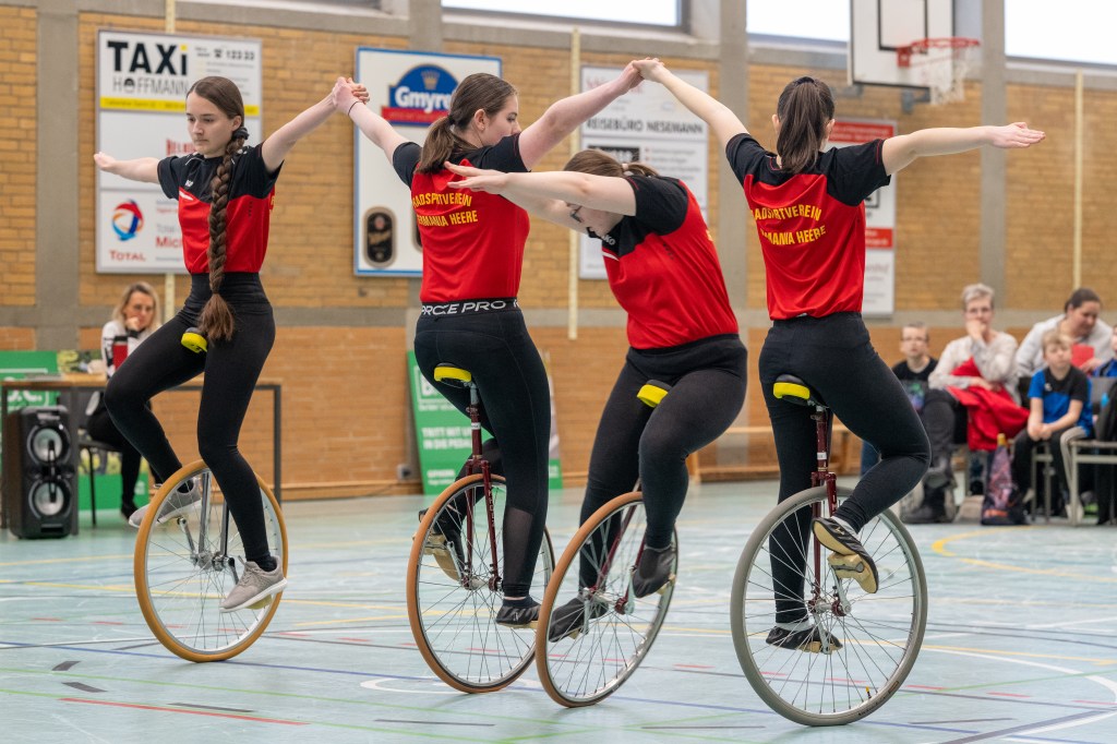 Eine weitere große Überraschung gelang der 4er Einradsport-Mannschaft des RSV Germania Heere mit den Fahrerinnen Annabell und Antonia Wagner, Anja Wagner und Sarah Abrams. Mit einer sauber gefahrenen Kür und einer persönlichen Bestleistung sicherten sie sich ebenfalls den ersten Platz.