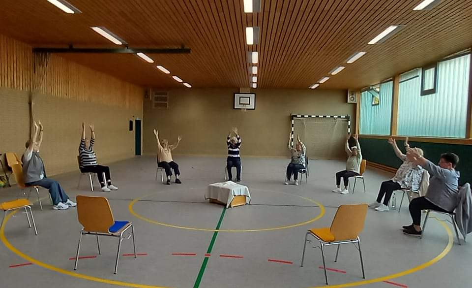 Das Älterwerden hindert uns nicht, unsere Stuhlgymnastik intensiv, aber mit viel Spaß an der Sache auszuüben. Wir bewegen uns, unserem Alter und unserer Mobilität entsprechend angepasst, mit und ohne Handgeräte im Rhythmus der Musik, auf dem Stuhl sitzend oder an der Stuhllehne festhaltend. Dabei nehmen wir manchmal erstaunt wahr, welche Muskeln wir haben und noch aktivieren können.
